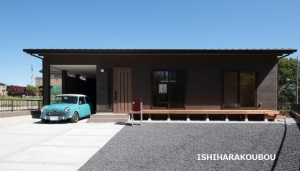 空に走る線が美しい片流れの構造をいかし、ロフトが設けられたガレージ一体型の平屋邸宅。
